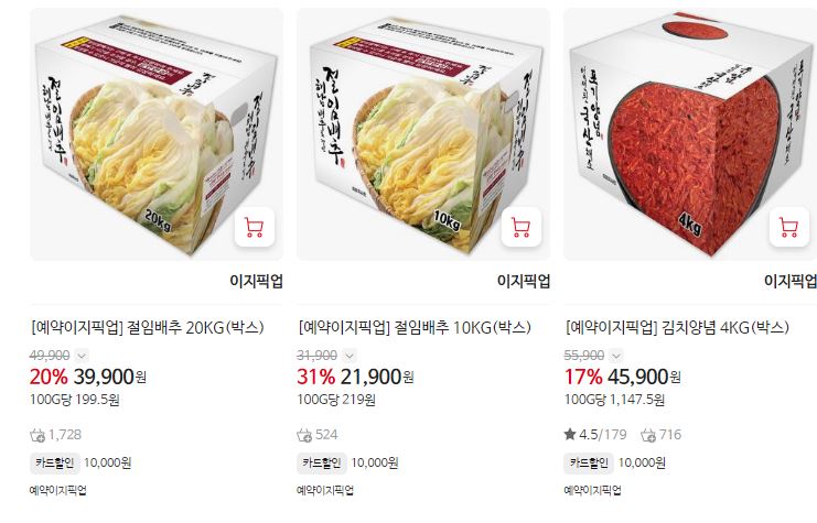 20kg의 절임배추는 사전예약 시 39,900원에 구매할 수 있으며, 일반 가격은 44,900원이니 미리 예약하는 것이 훨씬 이득이죠
