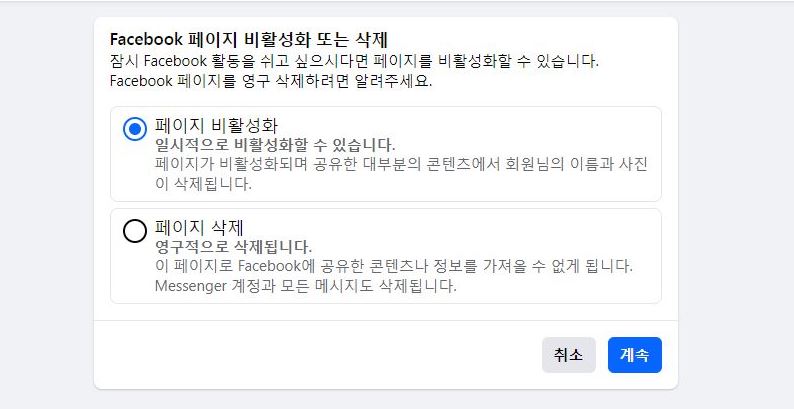 만약 페이지를 잠시 비활성화하고 싶다면, 삭제 대신 비활성화 옵션을 선택할 수 있어요.