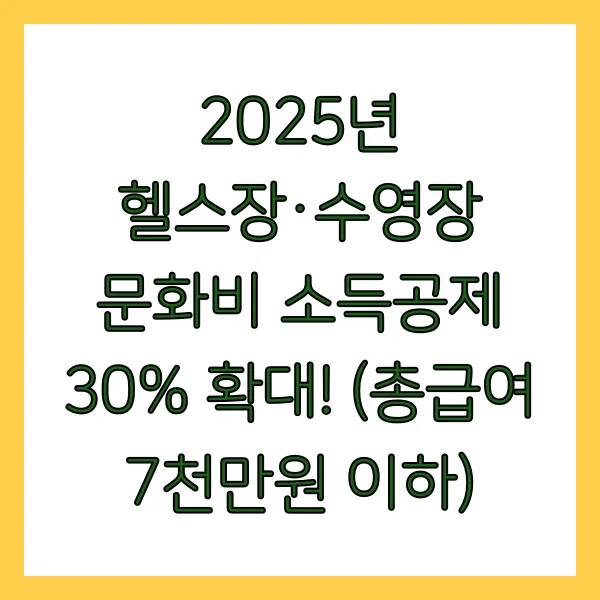 헬스장과 수영장! 이제 운동하며 돈도 아끼는 시대가 열립니다! 2025년 7월부터 총급여 7천만원 이하 근로자는 헬스장, 수영장 이용료의 30%를 최대 300만원까지 소득공제 받을 수 있습니다. 건강도 챙기고, 세금 혜택까지 누리는 절호의 찬스! 놓치지 마세요~ 지금 바로 자세한 내용을 확인해보세요! (키워드: 헬스장 소득공제, 수영장 소득공제, 문화비 소득공제, 헬스장, 수영장, 소득공제, 7천만원 이하, 30%, 300만원)