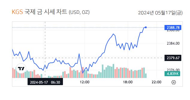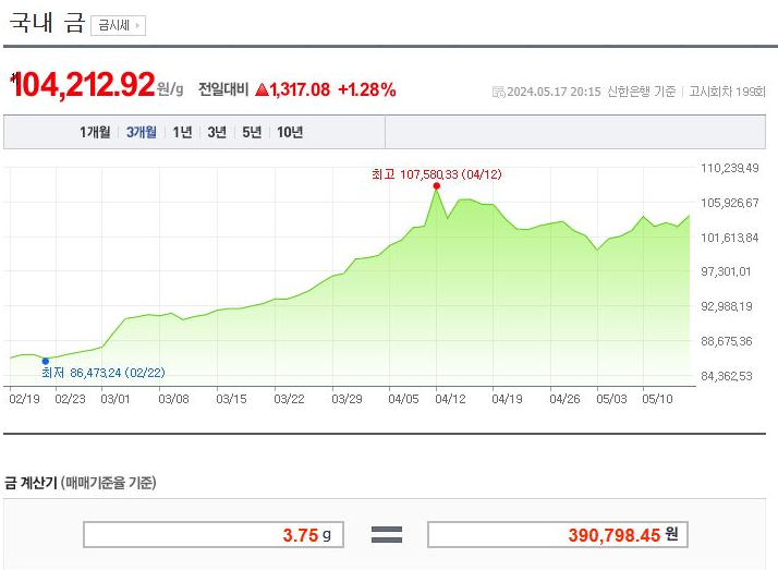 5월17일 신한은행 기준으로 조회해본 결과 3.75g당 우리돈으로 39만원이 넘었습니다.
